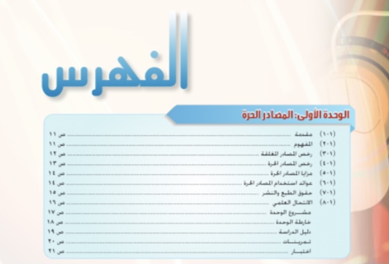 تتحدث الوحده الاولى عن المصادر الحرة وهي ٨ مواضيع تتضمن رخص المصادر المغلقة و رخص المصادر الحرة